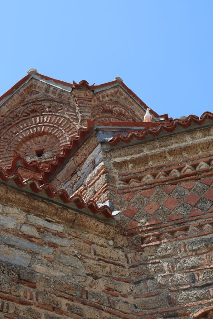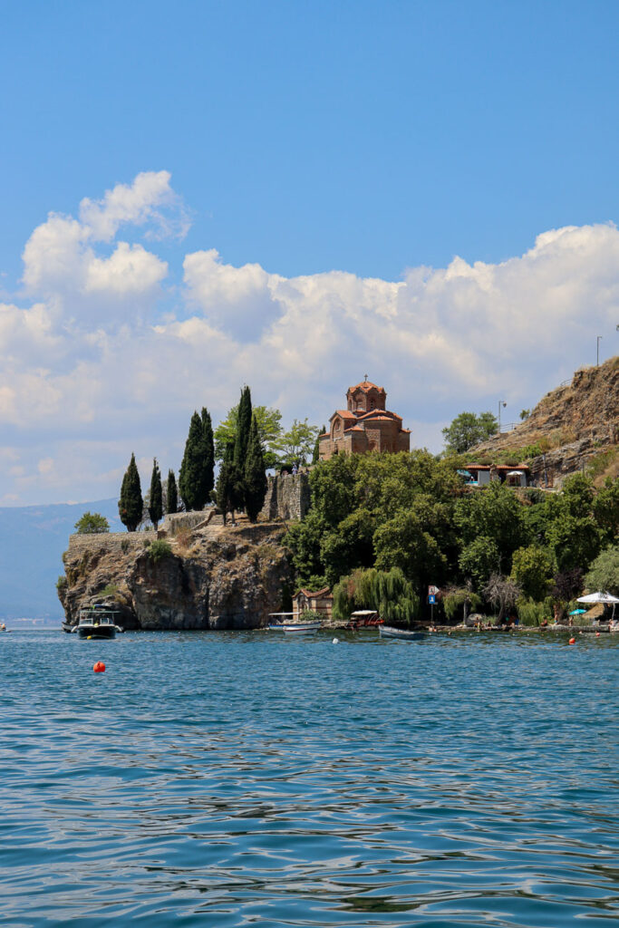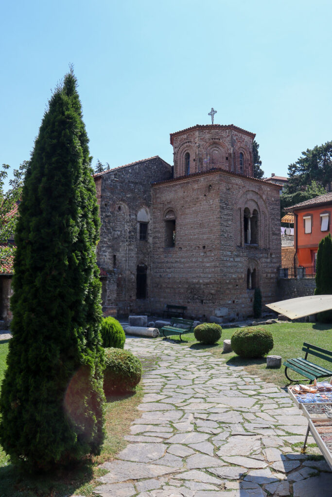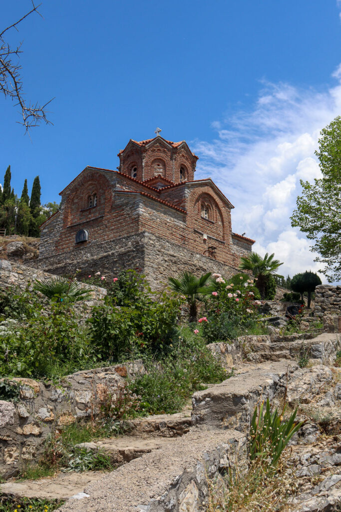 When the boardwalk ends, head up the small street on your right and continue walking toward Ohrid’s most iconic landmark: the Church of St. John the Theologian.